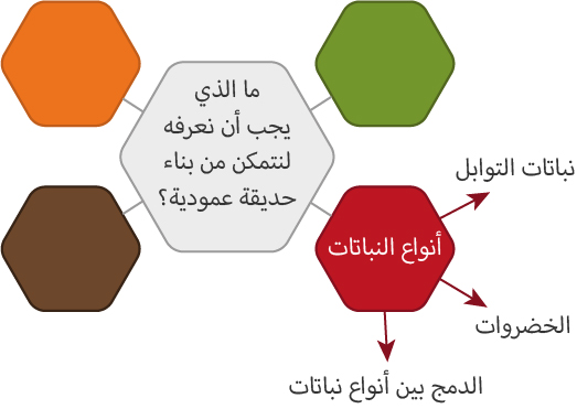 - يجب على كل مجموعة أن تجمع المعلومات حول الجوانب التالية اللازمة من أجل إنشاء حديقة عمودية: